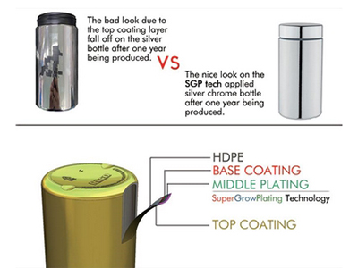 Después de que el proceso de cromado o metalizado se haya completado, las botellas toman un brillo extraordinario que puede personalizarse en cualquier color. Por favor, vea la página de personalización a continuación para saber cómo crear lo patrones que desee o la paleta de colores a su gusto.
